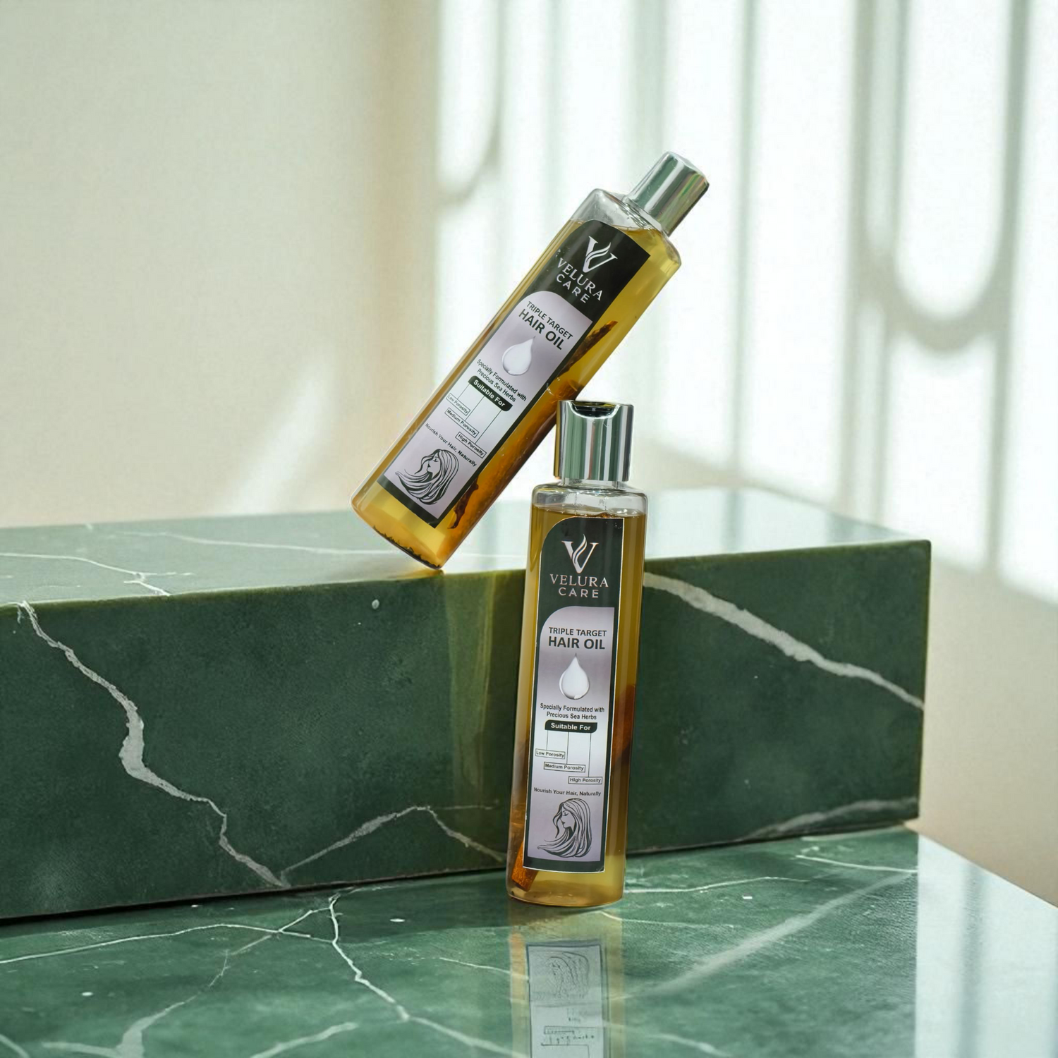 Working with hair care experts and herbalists, we formulated the Triple Target Hair Oil—a luxurious blend of over 10 powerful herbal oils, deep-sea botanicals, and silk clay, designed to target the root causes of hair damage across all hair porosity types. The result? A truly universal formula that promotes growth, strength, and shine.